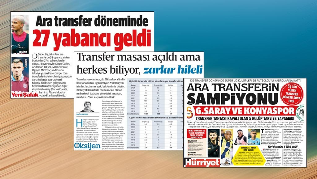 “24 Aralık-13 Ocak tarihleri arasında Fanatik, Fotomaç, Sabah, Milliyet ve Hürriyet gazetelerinde Fenerbahçe’ye 48, Galatasaray’a 46 oyuncu yakıştırılmış. Kimler yok ki listede? İlginçtir, koca transfer okyanusunda aynı isimlere ‘sarkıyorlar’. Oysa Fenerbahçe ve Galatasaray’ın son 10 yılda devre arası transfer ortalamaları toplam 5’i zor geçiyor.”