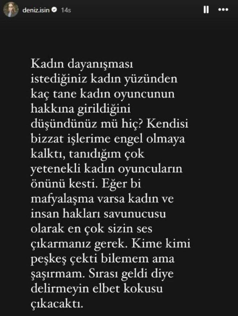 Deniz Işın, Ayşe Barım ile ilgili iddialar sonrası tartışmaya dahil olmuş, ünlü menajerin işlerine engel olmaya kalktığını savunmuştu: Kadın dayanışması istediğiniz kadın yüzünden kaç tane kadın oyuncunun hakkına girildiğini düşündünüz mü hiç? Kendisi bizzat işlerime engel olmaya kalktı, tanıdığım çok yetenekli kadın oyuncuların önünü kesti. Eğer bir mafyalaşma varsa kadın ve insan hakları savunucusu olarak en çok sizin ses çıkarmanız gerek. Kime kimi peşkeş çekti bilemem ama şaşırmam. Sırası geldi diye delirmeyin elbet kokusu çıkacaktı.